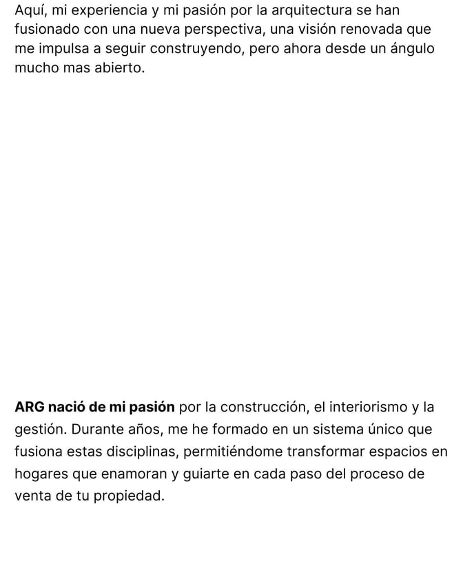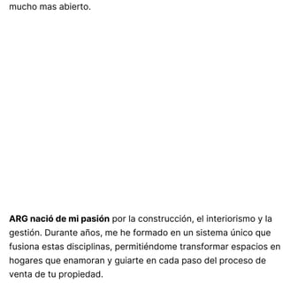 ARG nació de mi pasión por la construcción, el interiorismo y la gestión. Durante años, me he formado un sistema único que fusiona estas disciplinas, permitiéndome transformar espacios en sitios que enamoran. Y guiándote en cada paso del proceso de venta de tu propiedad.